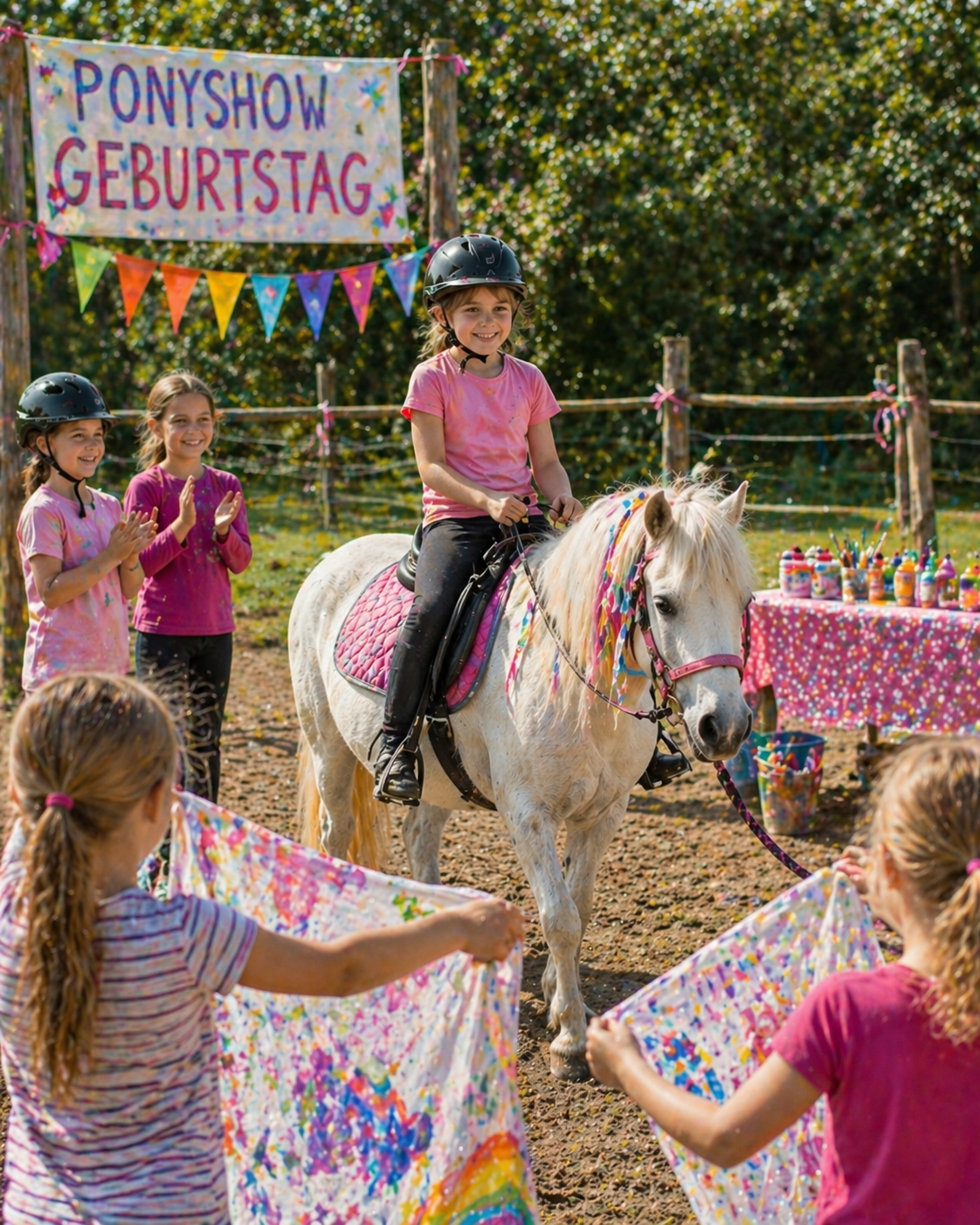 Kunststücke auf dem Ponyrücken ist eine tolle Sache, an deinem Geburtstag machen wir das ganze noch etwas bunter mit selbst gestalteten Tüchern, die wir vorher hübsch anmalen!