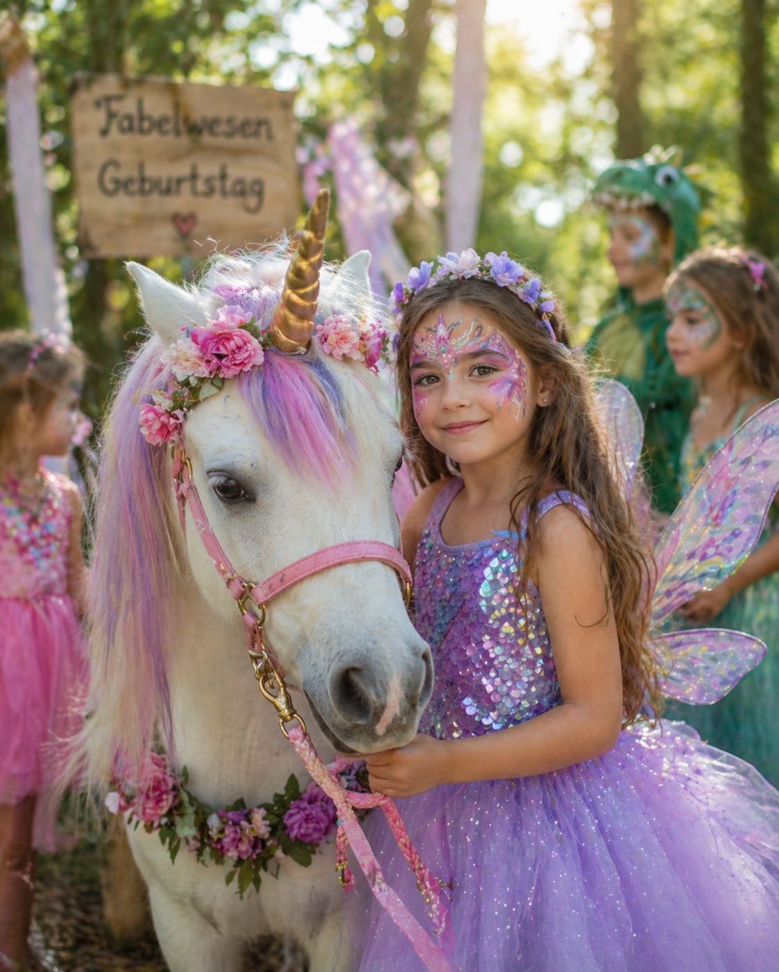 Fee? Meerjungfrau? Drache? Mal schauen welche Fabelwesen wir bei diesem Geburtstag entdecken! Lasst euch als ein Fabelwesen schminken und reitet anschließend auf deinem zauberhaften Einhorn!